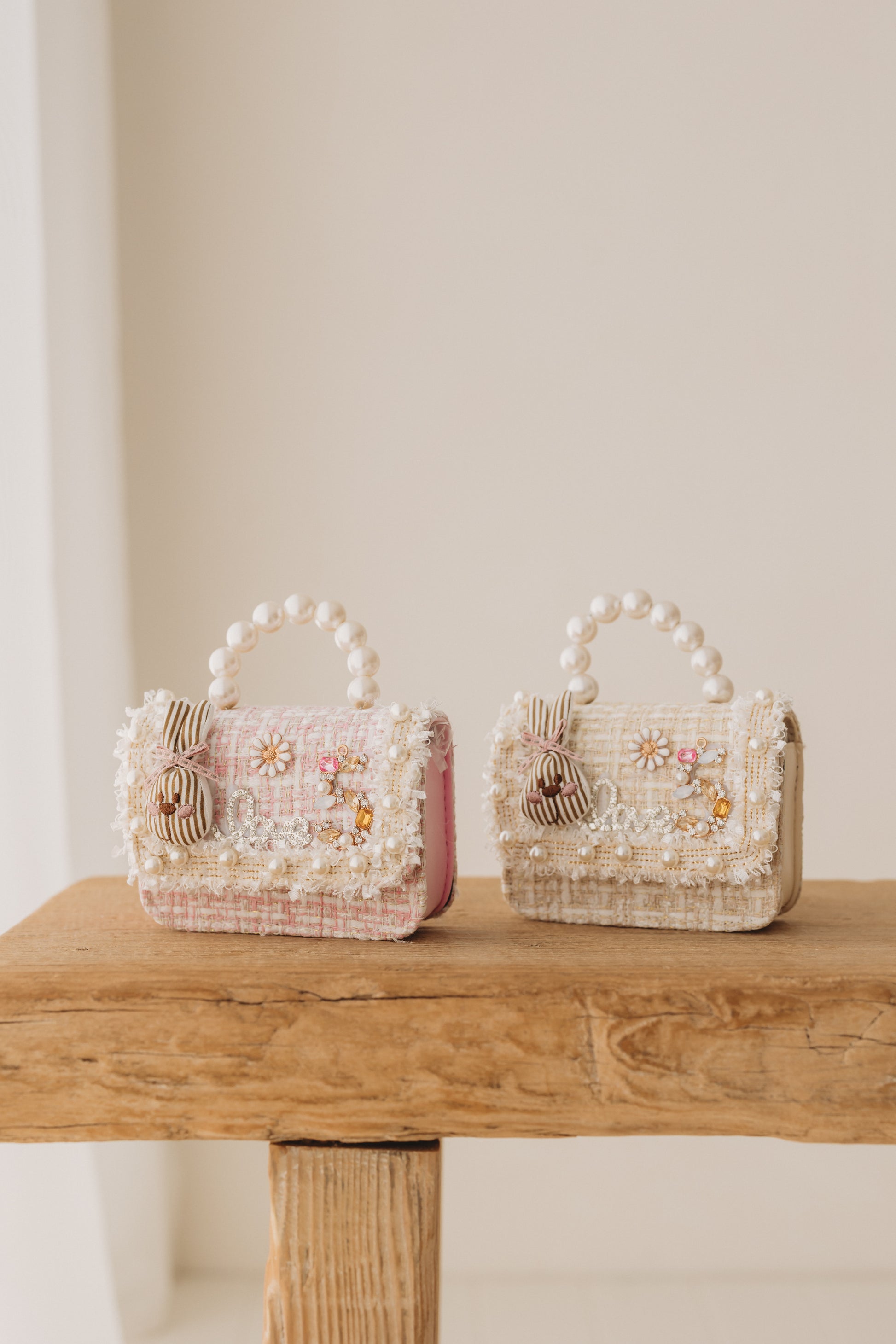 A chic tweed design in cream, adorned with subtle embellishments for the perfect elevated look.